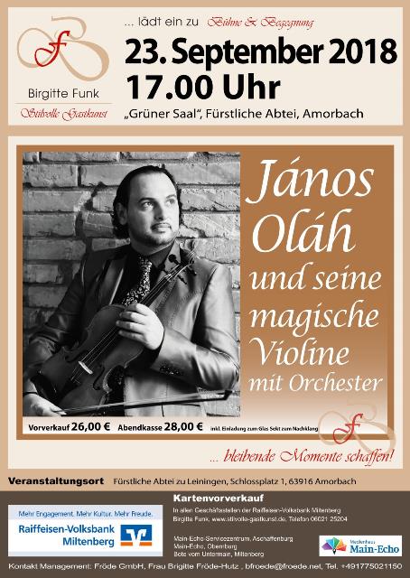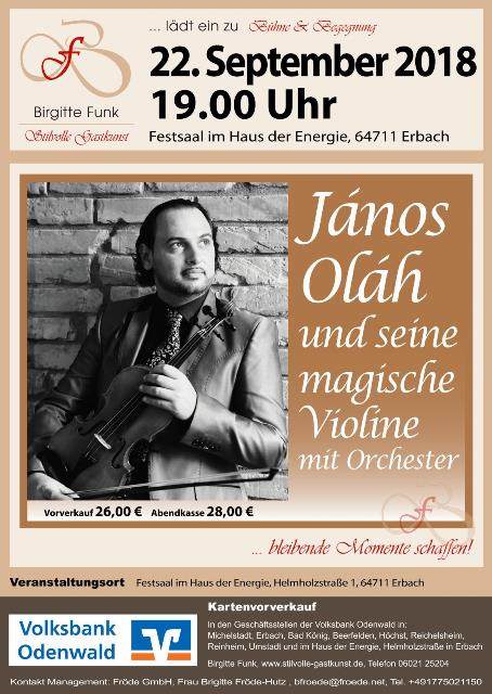 Dieser neuen Herausforderung stellte sich unsere GF im Jahr 2017 mit dem Management des Ausnahmegeigers János Oláh und dem gemeinsamen Projekt ,Magic Violin‘. Nach professioneller Tonstudioarbeit des Künstlers mit seinem kleinen Orchester in Ungarn folgten in rascher Folge 2 LIVE-Konzerte in der portugiesischen Algarve unter der Schirmherrschaft des dtsch. Honorarkonsuls in Portugal, die jeweils ausverkauft und mit teilweise stehenden Ovationen für den Künstler und seinen Pianisten bedacht waren. Zu erleben unter www.Janos-Olah.com.